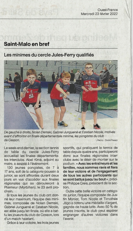 ARTICLE OUEST FRANCE DU 23/02/2022